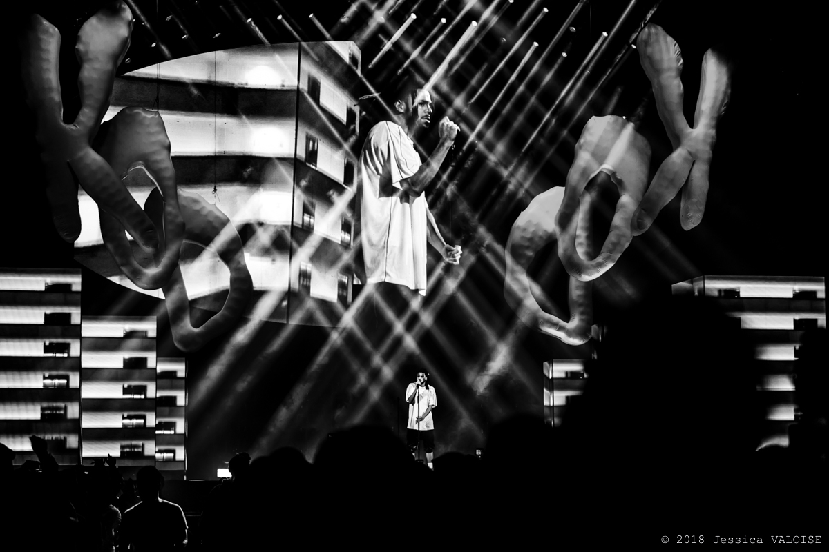J. Cole arrive sur scène en toute simplicité : t-shirt blanc, pantalon noir, pas de bijoux. On sait pourquoi on est là : pas de superflu, mais un message à écouter. En apparence seul sur la grande scène du Centre Bell, un orchestre complet se cache en fait derrière les écrans géants verticaux tels de grandes colonnes rectangulaires qui diffusent des images en rapport avec les morceaux interprétés : batteur, bassiste, guitariste, violonistes, choristes, DJ… Finalement, nous les verrons par intermittence sur l’écran géant oval situé derrière J. Cole.
