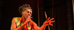 Hier soir, Admiral T s’est donné en spectacle à l’occasion du Festival Nuits d’Afrique. Pour sa deuxième fois à Montréal, c’est sur une scène extérieur qu’il se produit, avec un parterre plein. Des fins connaisseurs à ceux qui le découvrent, des plus jeunes aux plus âgés, Admiral T semble faire l’unanimité. Il chante autant qu’il danse, joue de la guitare et du tambour… Une énergie folle et contagieuse. Si bien qu’à la fin du show, il demande au Festival de lui accorder une débordement d’horaire, ce que le Festival accepte. Et c’est parti pour 15 minutes supplémentaires! Également connu pour son humilité et sa générosité, Admiral T ne manque pas à sa réputation : il invite à danser sur scène trois spectateurs plus que ravis! À la fin du show, il remercie chaque personne ayant contribué à rendre ce spectacle possible, des musiciens à l’ingénieur du son, en passant par les médias. On sent qu’il a du mal à quitter la scène, le public a du mal à le laisser partir. À l’année prochaine?